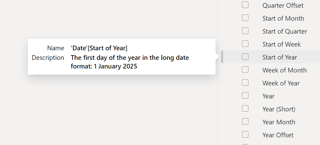 You can download this tool completely free, available as a ready-to-use .pbix file. The beauty of downloading the PBIX file, is that all the columns have already been configured with the correct "Sort By" options, descriptions have been set and relationships created.