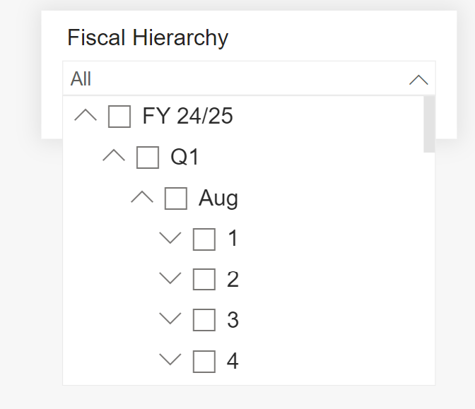 Save time and keep it consistent with pre-built hierarchies. One for Date Hierarchy (Year, Quarter, Month, Day) and one for Fiscal Hierarchy (Fiscal Year, Fiscal Quarter, Month, Day)